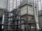 原料自原料倉經計量電子秤進入到NSE380 板鏈提升機垂直運輸到制砂樓最高點,經溜槽進入到制砂機破碎,經過封閉溜槽進入到高頻篩進行篩分 在這里一部分超標品進入到單傳動輥壓機碾壓后返回提升機進入破碎循環,篩下的成品靠自重進入到AVC3000選粉機中,合格的顆粒經加濕拌合機進入成品庫,超標粉塵經粗細粉分離機進入到布袋收塵器,在這里大于0.075的粗顆粒返回到成品砂中,小于0.075mm的粉塵進入到鋼板倉中儲存起來外運。