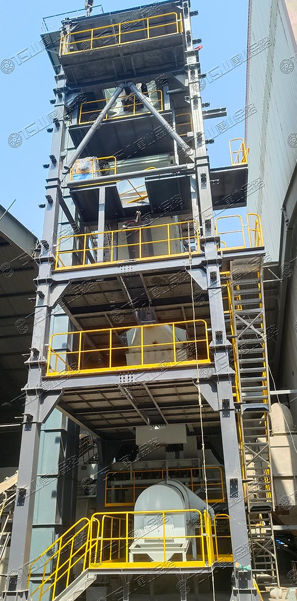 這套V8-100干法制砂樓,總投料量為100噸,整條生產線設備選型為:制砂選粉一體機、高頻篩、無動力選粉機、粗細粉分離機、加濕拌合機等。